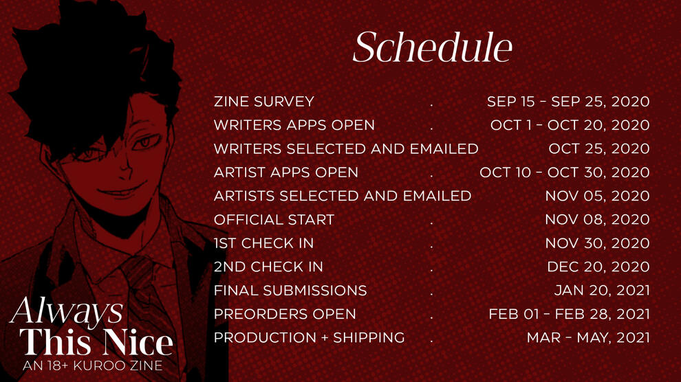 Always This Nice is a for profit, 18+ (NSFW) zine focused on Kuroo Tetsurou [Nekoma Grad, Sports Promoter with the Japanese Volleyball Association, erstwhile shady cat, now a shadier cat] and all the sexy fun he has.The theme as it stands is canon/canon-adjacent, post-timeskip, with Kuroo keeping his role as sports promoter, but leaving everything else up to the creators discretion. This may change post-interest check. All characters are adults and all activities will be consensual.The zine will be produced both physically and digitally, and will be rated R for explicit sexual content.